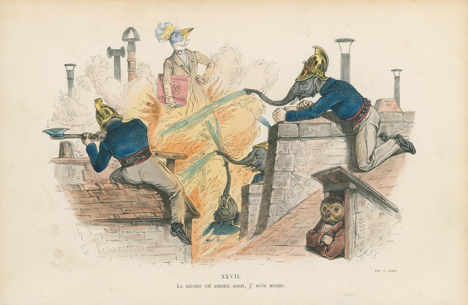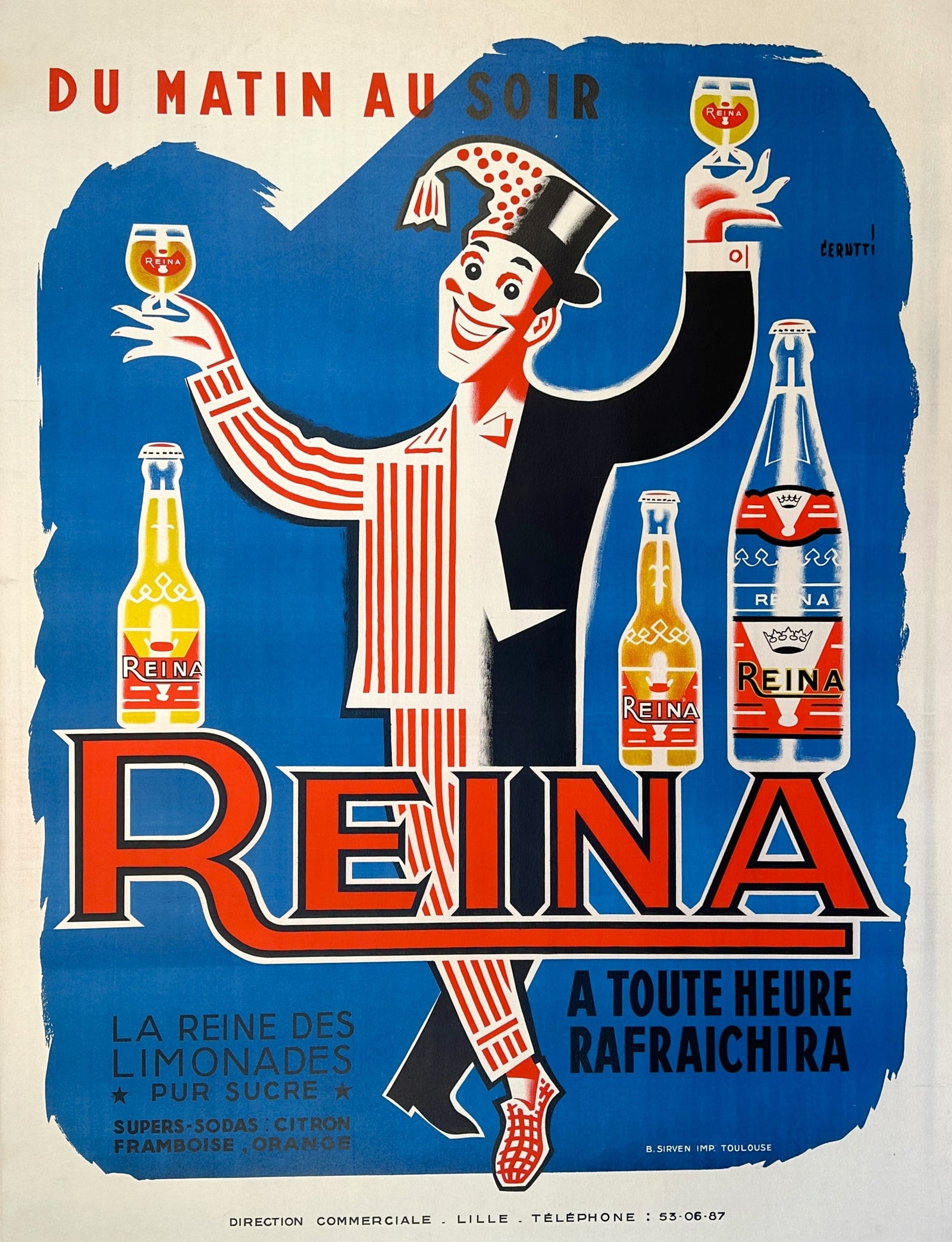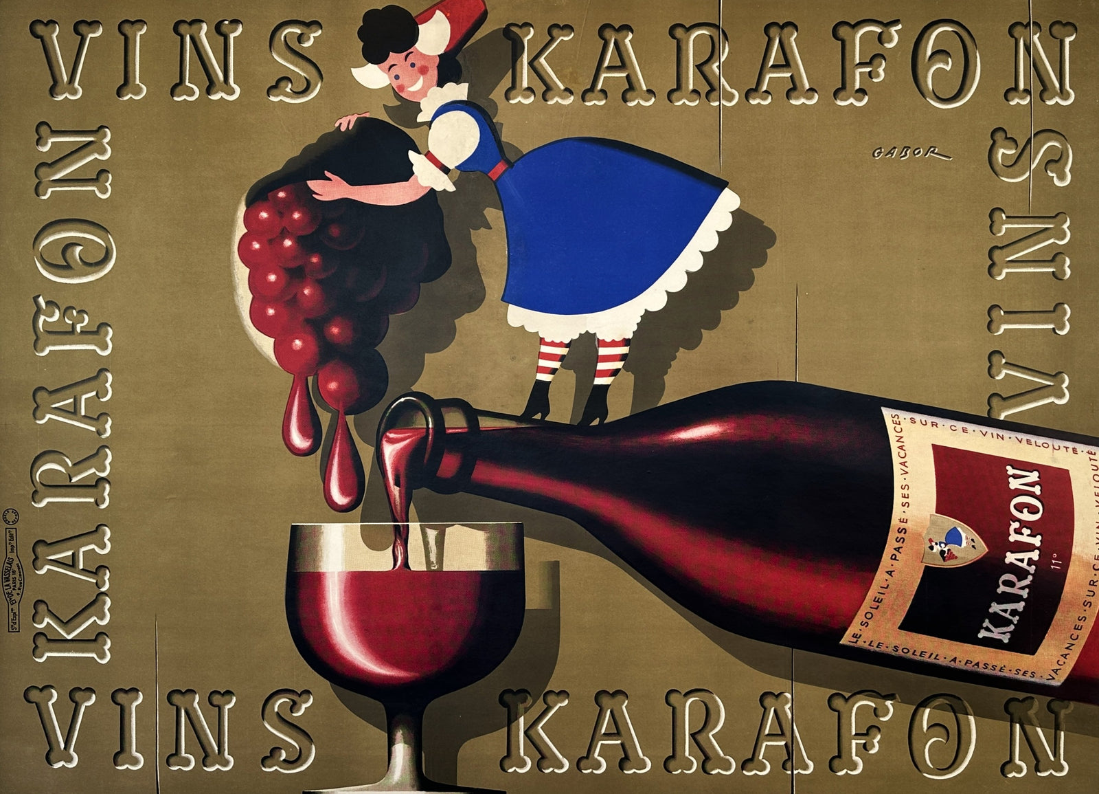 Two people stand at a large table in a bright, modern gallery, discussing vintage posters. Colorful posters cover the walls and tables, and large windows let in natural light from outside.