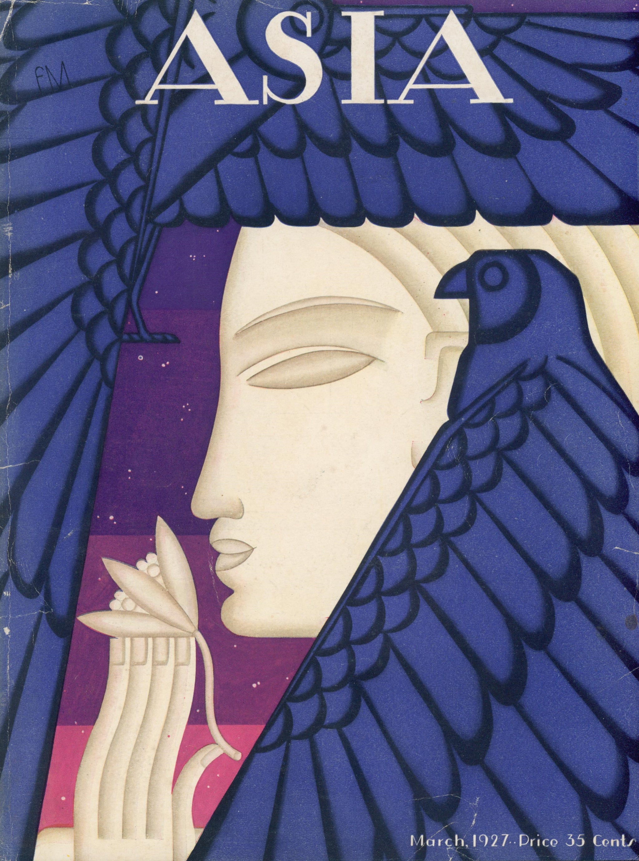 This mesmerizing Asia magazine cover from March 1927 showcases Frank McIntosh at the height of his Art Deco powers. The composition presents a serene goddess figure whose wings fill the frame in graduated shades of cobalt and navy, while a stylized blue bird perches at her shoulder. Her elegant hand holds delicate flowering branches, symbols of peace and renewal, as a purple starfield glows behind her.