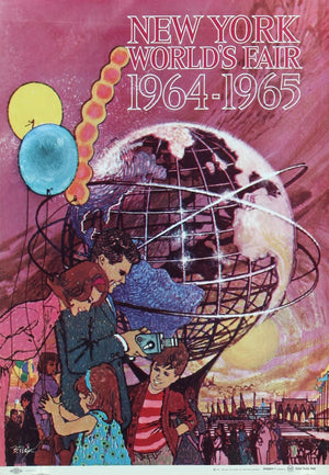 Robert Peak's official promotional poster for the 1964-65 New York World's Fair captures the era's boundless optimism in one electrifying image. The Unisphere, that magnificent stainless steel globe in Flushing Meadows, dominates the composition while a young family experiences the fair below. Peak's signature painterly style transforms a promotional piece into genuine mid-century art, with hot magenta skies, floating balloons, and a father filming his family creating an indelible portrait of Space Age America.