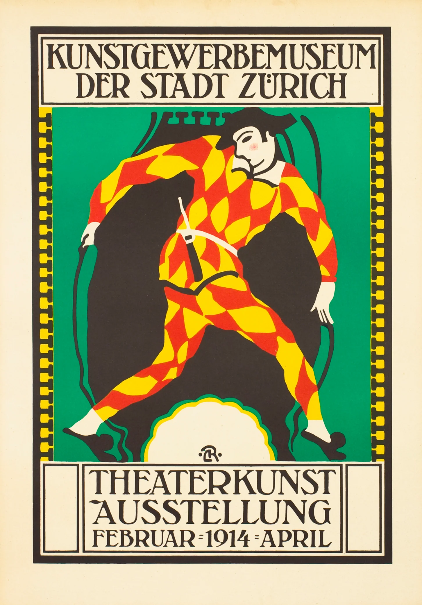 This poster was created in 1914 to promote the Theaterkunst Ausstellung at the Kunstgewerbemuseum der Stadt Zürich, an exhibition dedicated to the art of theater, including costume, stage design, and performance aesthetics. Held from February through April 1914, the exhibition reflects the growing recognition of theater as a serious artistic discipline within early twentieth century European cultural institutions.