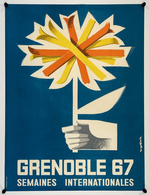 A striking slice of 60s French design that captures the playful spirit of an Olympic host city ready to shine. A must for collectors of vintage ski posters, Olympic history, or bold modernist graphics.A burst of color for the 1967 Grenoble International Weeks: this original mid-century poster beams with optimism and modernist flair. Designed by Guy Georget, a celebrated French graphic artist known for his bold, abstract forms, this piece captures the spirit of cultural exchange and festivity that defined Grenoble’s international events leading up to the 1968 Winter Olympics.