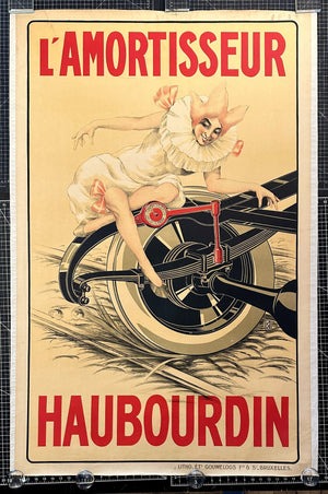 In this graphic the cheeky madame is dressed in a Pierrot inspired costume, gracefully balanced across a large mechanical wheel that showcases the Haubourdin shock absorber, the product being promoted! The exaggerated wheel, the polished metal, and the bright red mechanism all highlight the precision engineering behind Haubourdin’s suspension system. At the same time, the floating figure and sweeping lines soften the composition, keeping it light and inviting.