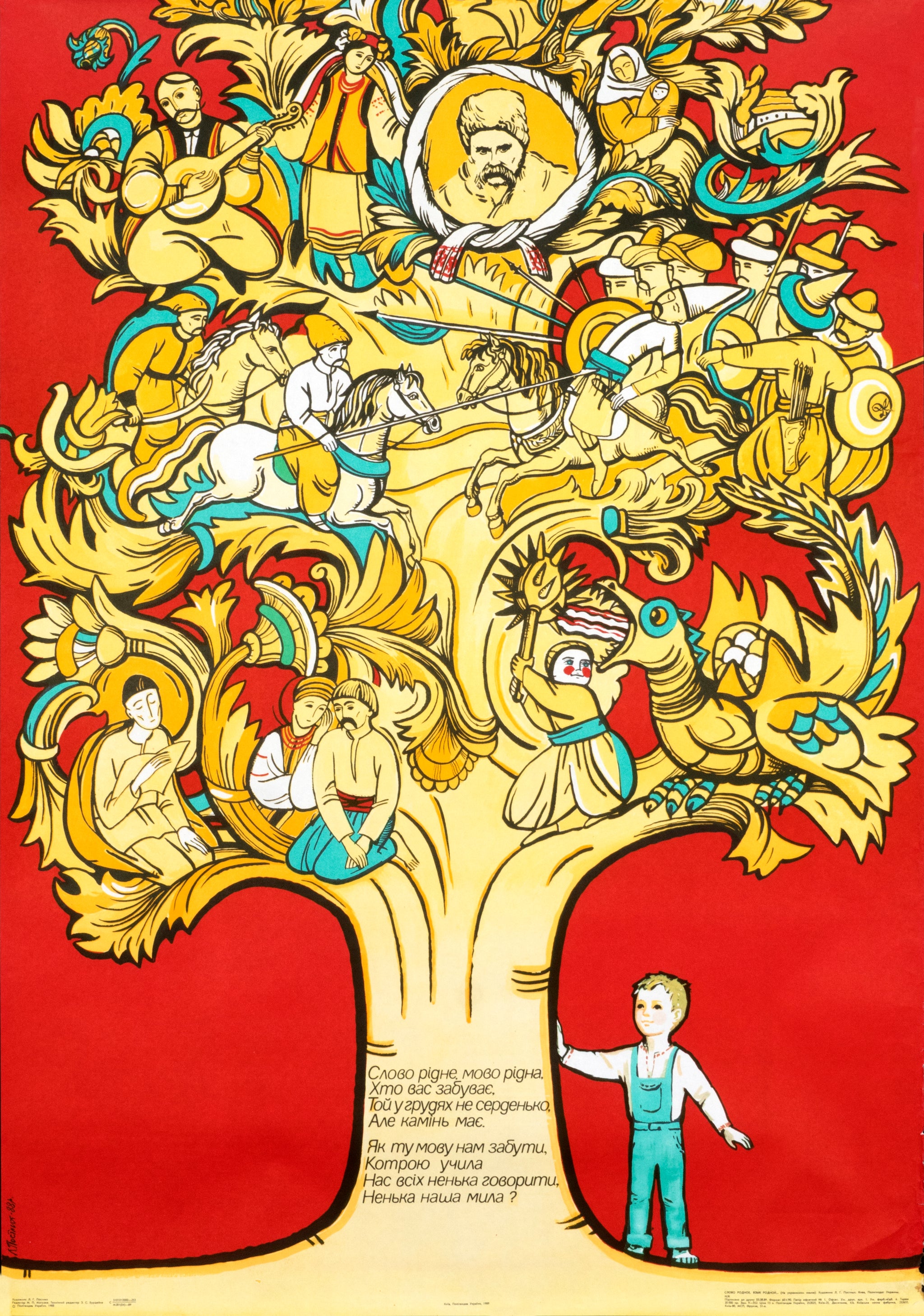 The image centers on a great golden tree filled with scenes from Ukrainian history and daily life. Poets, horsemen, and musicians appear among the branches, each figure drawn in the fluid, decorative style of traditional folk art. At the roots stands a young boy, looking upward with quiet wonder, representing a new generation learning to honor and preserve its heritage. The poem below, written in Ukrainian, speaks to the deep emotional tie between people and their native language, a subject that had long carried political weight under Soviet rule.