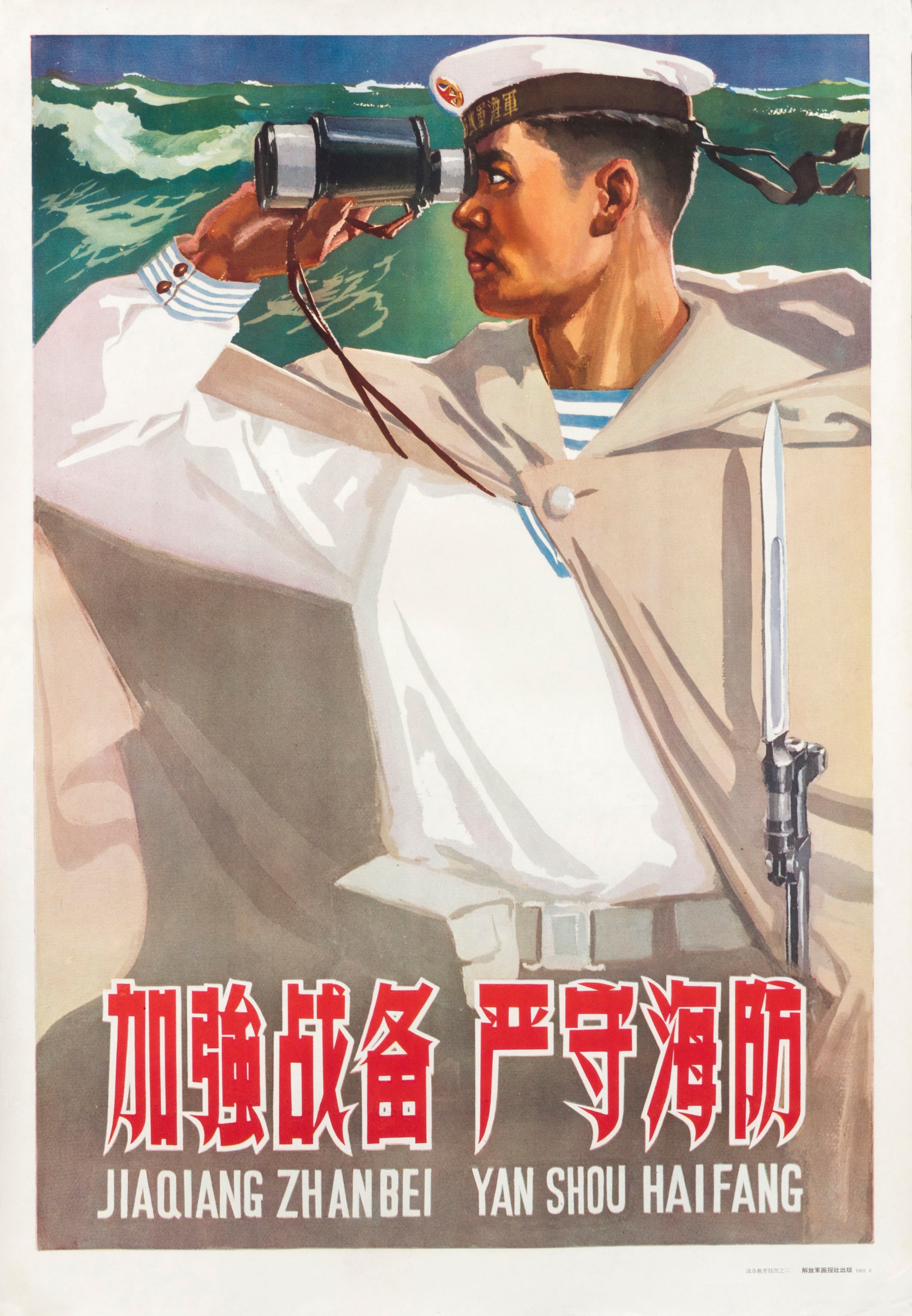 Standing tall against a crashing sea, a young sailor gazes through his binoculars, alert and unyielding. This 1962 Chinese propaganda poster, titled Jiaqiang Zhanbei, Yan Shou Haifang (Strengthen Battle Preparations, Strictly Guard Coastal Defense), captures the heroic energy of early Cold War China when national defense was as much about spirit as it was about strength.