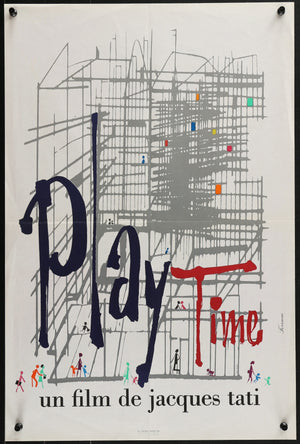 This original movie poster celebrates PlayTime, Jacques Tati’s visionary 1967 film and one of the most ambitious comedies ever made. The design mirrors the film’s world perfectly, a towering grid of modern architecture rendered in cool gray lines, punctuated by tiny pops of color and miniature figures navigating an overwhelming urban landscape. The hand drawn title cuts boldly across the scene, playful, imperfect, and unmistakably Tati.