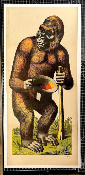 A gorilla with a top hat… why not? This extraordinary 19th-century French stone lithograph was printed by the renowned C. Burckardt & Cie in Wissembourg, Alsace during the 1880s. It belongs to a delightful series of large-format carnival and fairground panels that featured an eclectic mix of animals, comical characters, and satirical figures rendered in vivid color and fluid linework.