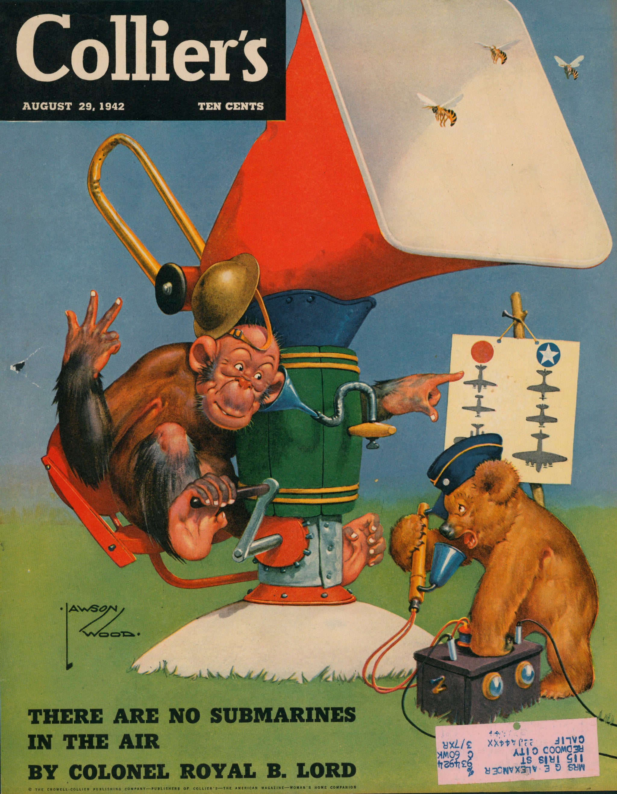 This delightful August 1942 Collier's cover by British illustrator Lawson Wood captures the absurdist humor that made his anthropomorphized animal illustrations beloved on both sides of the Atlantic. Here, a uniformed orangutan mans a cobbled-together aircraft spotting station, complete with brass listening horn, megaphone amplifier, and an official aircraft identification chart showing both Japanese and American plane silhouettes. His bear assistant, wearing a military cap, operates what appears to be a battery-powered communication device, while the 'aircraft' they've detected turns out to be a squadron of approaching bees.