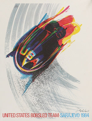 This original hand-signed lithograph by American artist Dennis Wheeler was created for the United States Bobsled Team at the 1984 Winter Olympics in Sarajevo, Yugoslavia. These Games were historic as the first Winter Olympics ever held in a socialist country and the only Olympic Games hosted by a Muslim-majority city. They brought together 49 nations and over 1,200 athletes, marking a moment of unity and optimism during the later years of the Cold War.
