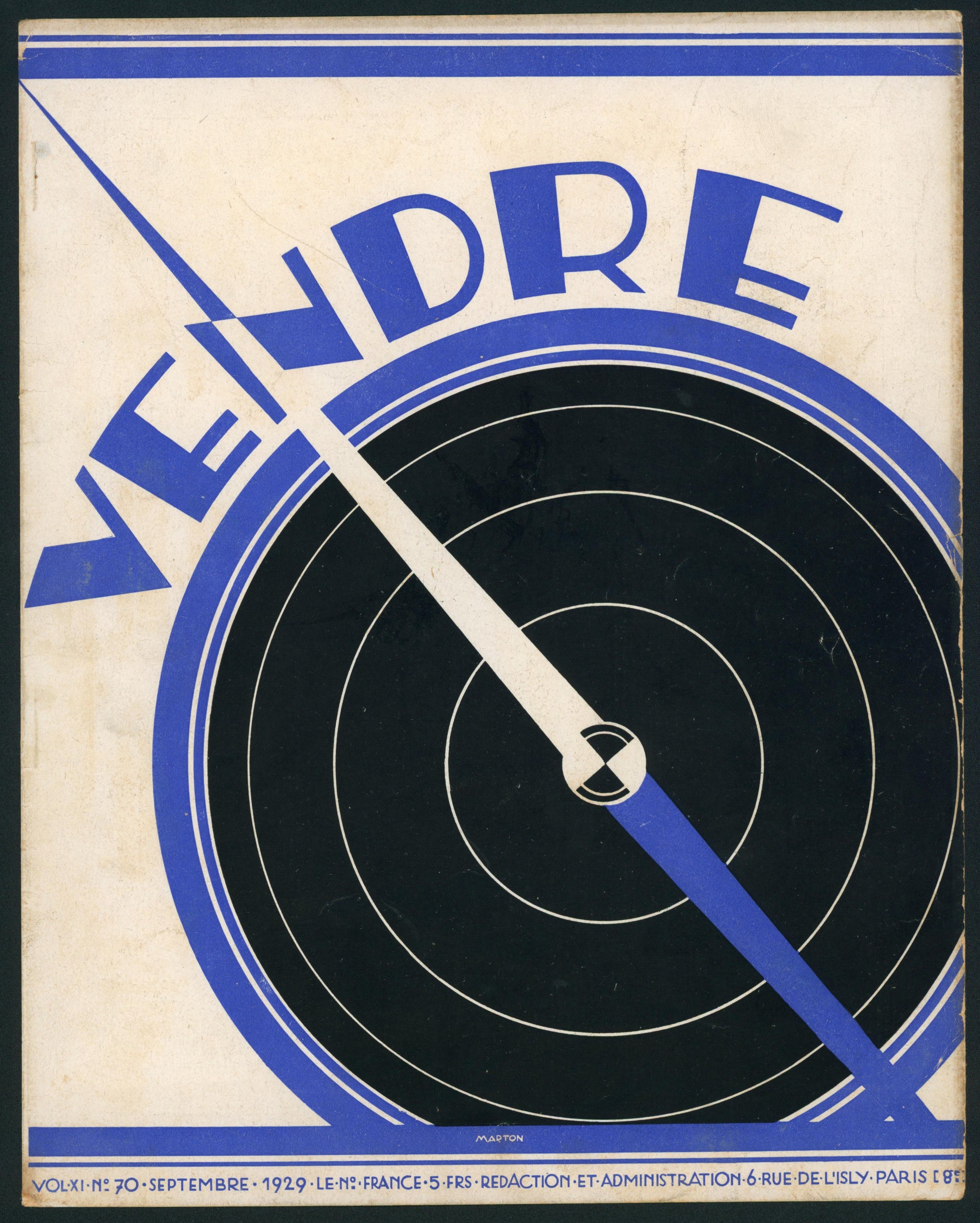 This September 1929 cover of Vendre magazine captures the apex of Art Deco commercial design just weeks before the Wall Street Crash would reshape the global economy. The composition reduces the essence of modern advertising to pure geometry, a bold diagonal thrust piercing concentric circles in a striking cobalt and black palette against cream.