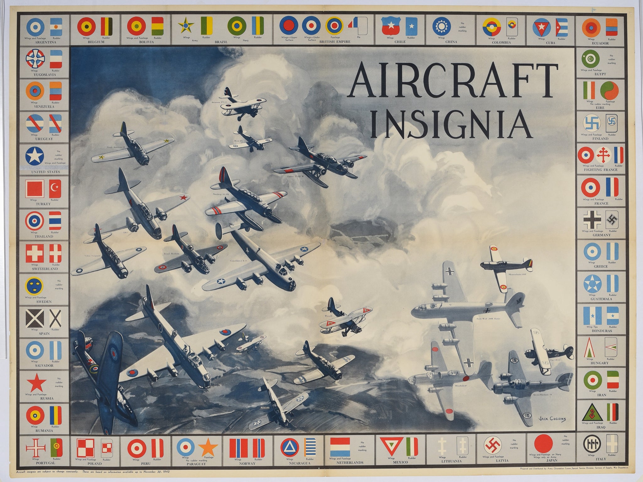 Aircraft Insignia, was created in 1942 by artist Jack Coggins for the Division of Information, Office of Emergency Management in Washington, D.C. It served as an official identification chart during World War II, helping both civilians and military personnel recognize Allied and Axis aircraft from a distance.