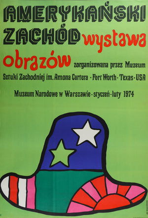 A cowboy hat bursts with stars and stripes, reimagined in vivid blocks of color and bold outlines. Jan Młodożeniec’s playful design announced Amerykański Zachód, the 1974 exhibition of Western American paintings organized by the Museum of Western Art in Fort Worth, Texas, and presented at the National Museum in Warsaw from January through February.
