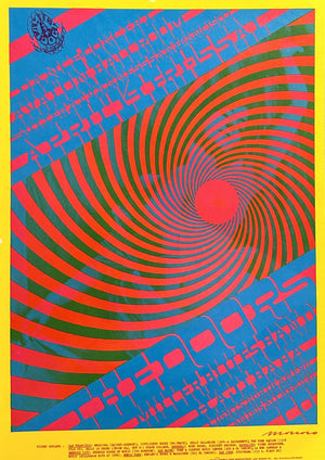 Moscoso employs his trademark vibrating colors and optical play, creating a spiraling vortex that seems to pull the viewer inward. The typography melts into the design, forcing the eye to work to decipher the names, a deliberate choice, rooted in Moscoso’s training in color theory and his desire to make posters as much an experience as the concerts themselves. Under blacklight, the neon red, green, and blue burst alive, amplifying the psychedelic impact.