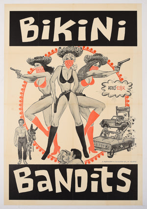 This original 1970 movie poster celebrates the outrageous, rebellious world of American exploitation cinema. Bikini Bandits tells the story of three fearless women who trade cowboy hats and bikinis for guns and grit, turning the Western outlaw myth into a tongue-in-cheek fantasy of female revenge and roadside chaos. With fast cars, flirtatious humor, and pulp-style action, it captured the spirit of the grindhouse era when independent filmmakers were pushing boundaries and celebrating excess on every level.