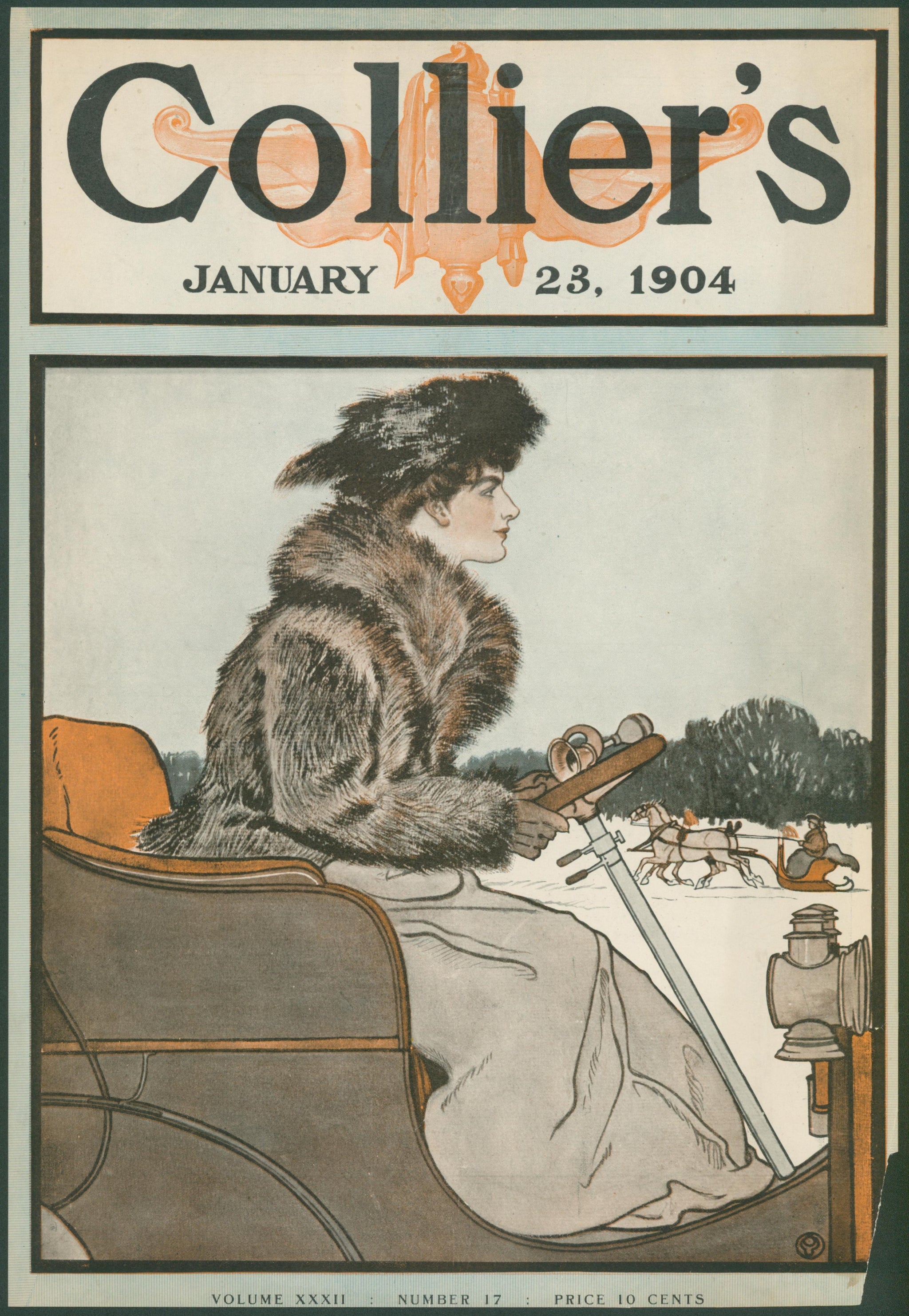 This striking Collier's magazine cover from January 1904 captures a pivotal moment in American transportation history. A fashionable woman wrapped in luxurious fur sits at the controls of an early automobile, her confident profile gazing forward into the future, while behind her a horse-drawn sleigh carries passengers through the winter landscape, a nostalgic reminder of the technology being left behind.