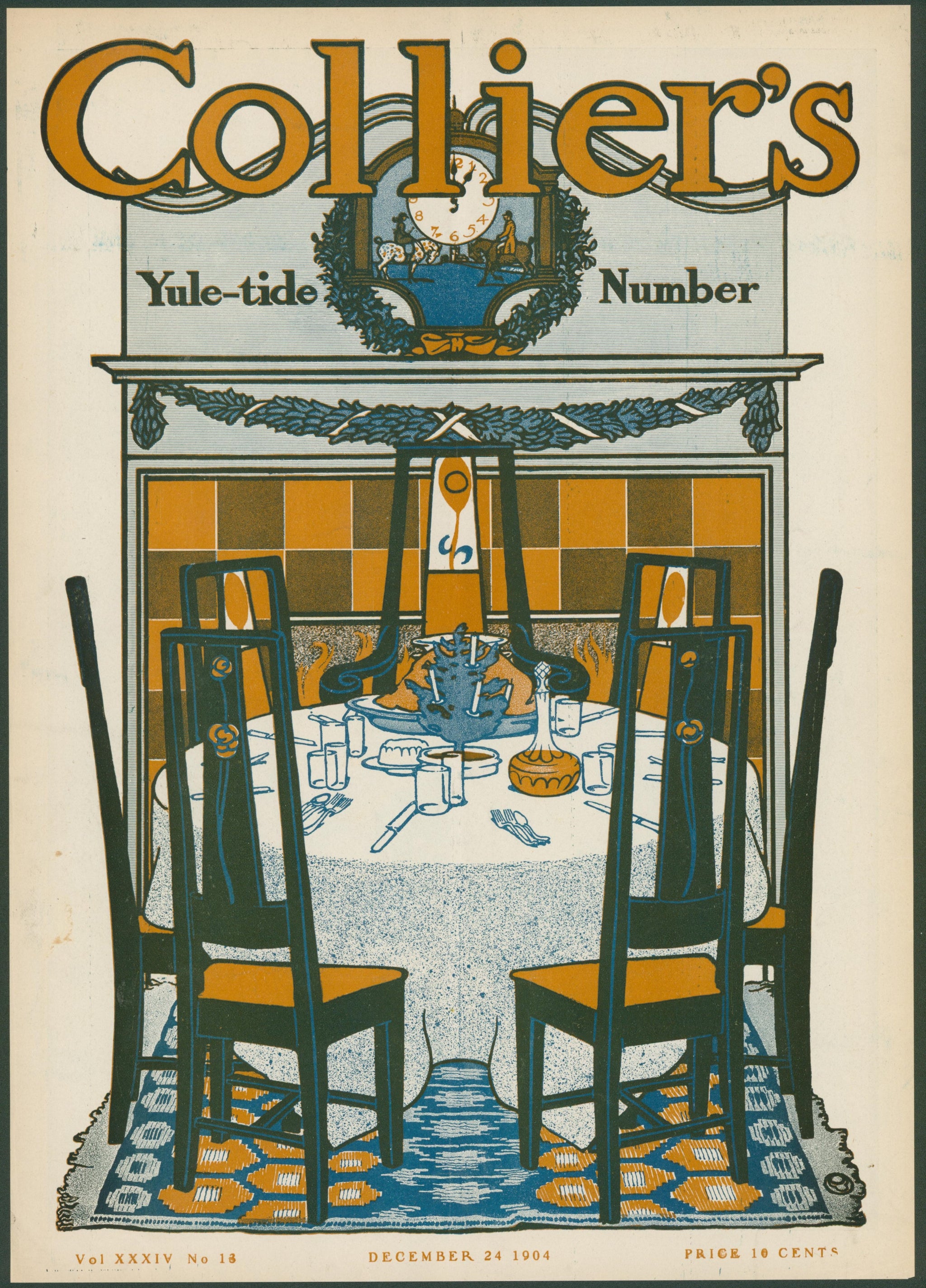 This enchanting Collier's Yule-tide Number from Christmas Eve 1904 captures the warmth and anticipation of an Edwardian holiday feast. The cover presents a beautifully set dining table awaiting its guests, viewed through the frame of four high-backed chairs in deep teal. Above the checkered amber and orange wall, a mantel clock encircled by a Christmas wreath marks the hour, while garlands drape the mantelpiece.