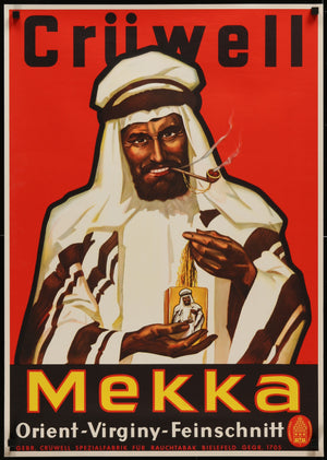 Produced by Gebr. Crüwell, the Bielefeld-based tobacco house established in 1705, this poster is pure mid-century salesmanship: bold, self-referential, and culturally loaded. The name "Mekka" and the stylized figure evoke an exotic fantasy, tying the product to faraway origins and ritual indulgence, regardless of the factual blend inside.