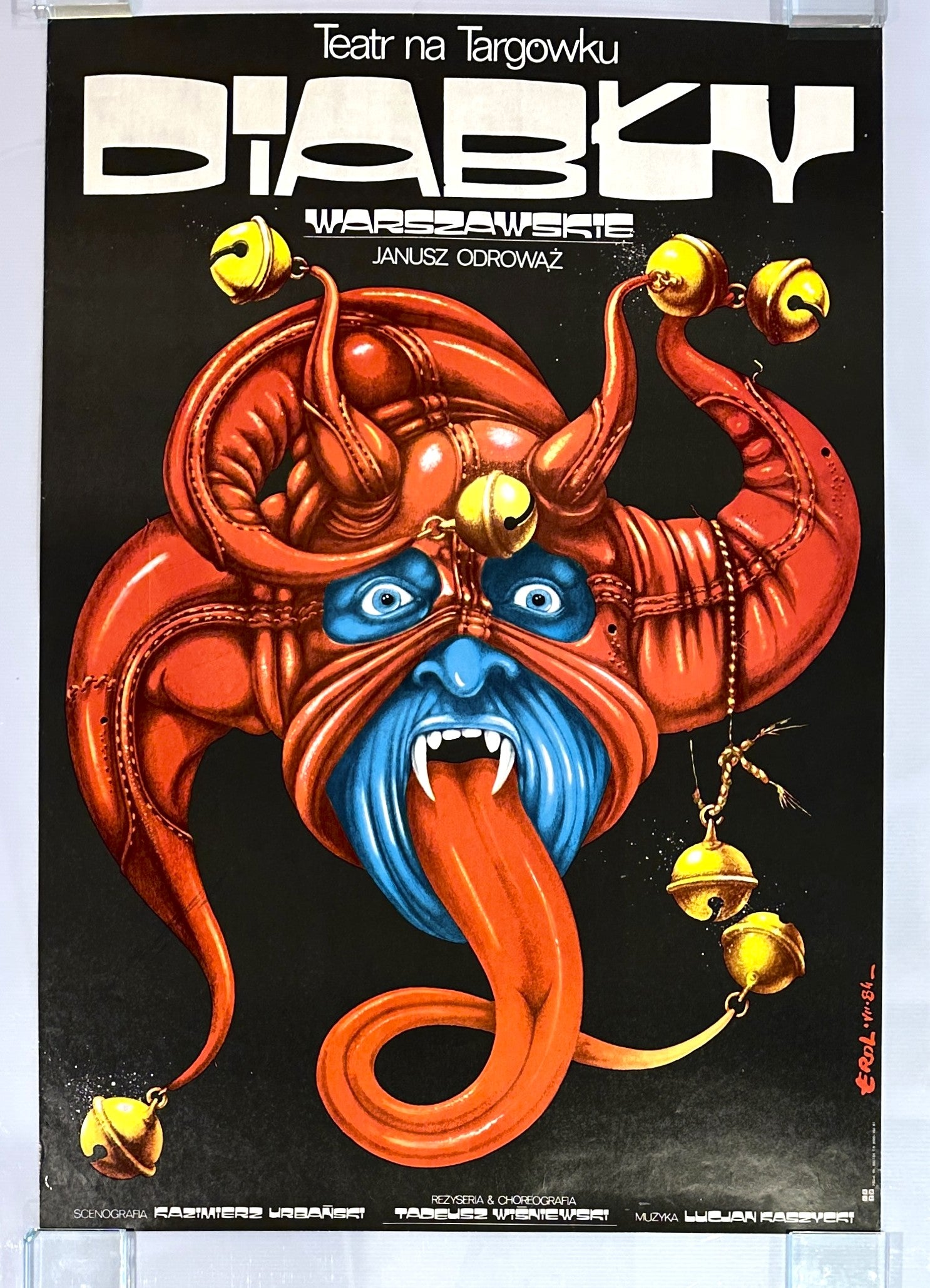 This vivid Polish theatre poster announces Diabły Warszawskie, which translates to The Devils of Warsaw, a production staged at Teatr na Targówku. It is pure theatrical excess in visual form. A horned, bell covered demon lunges forward with its tongue extended, eyes wide, bells jingling, and color turned up to maximum volume. There is no subtlety here, and that is exactly the point.