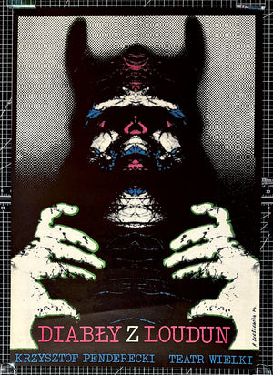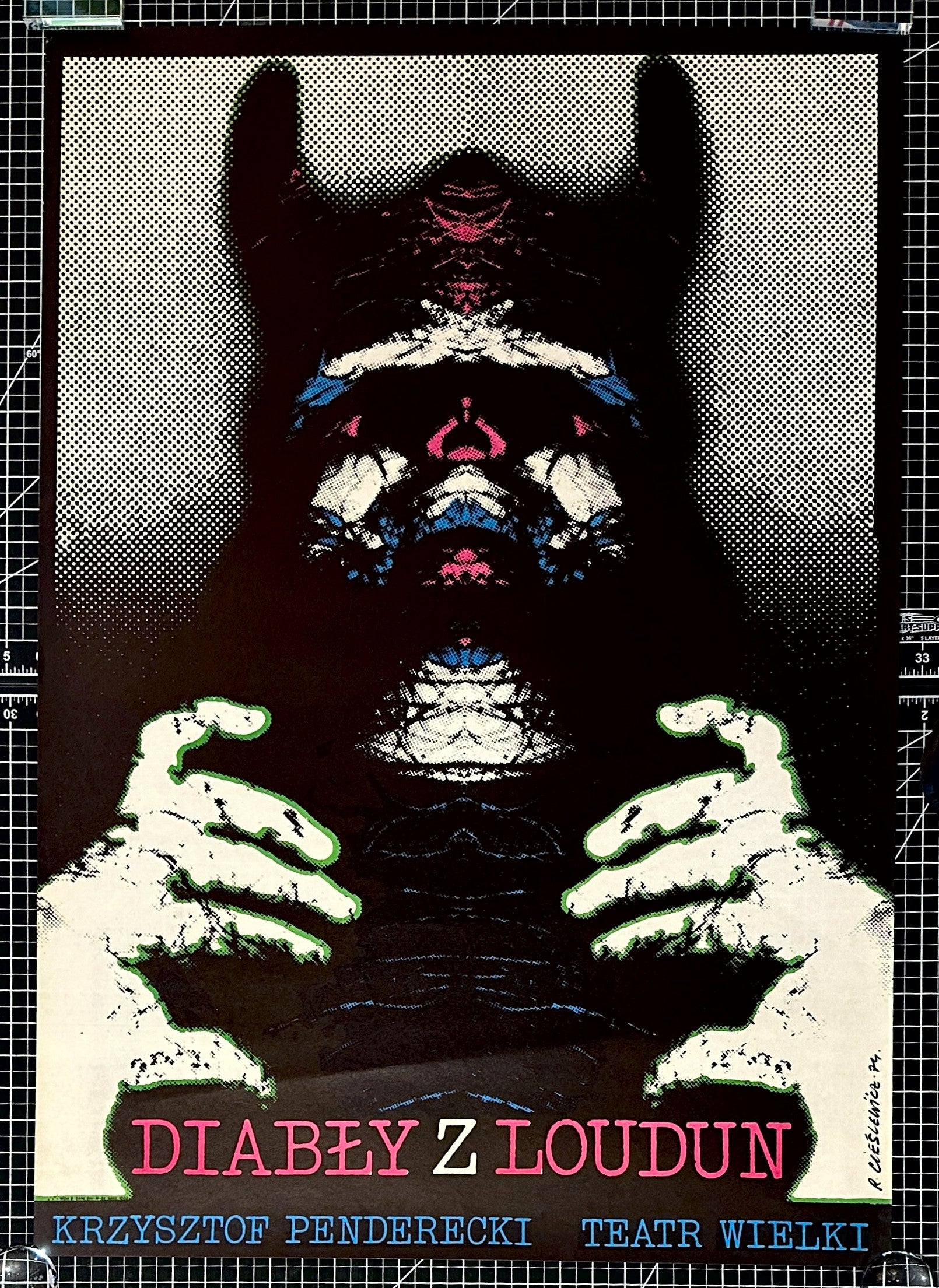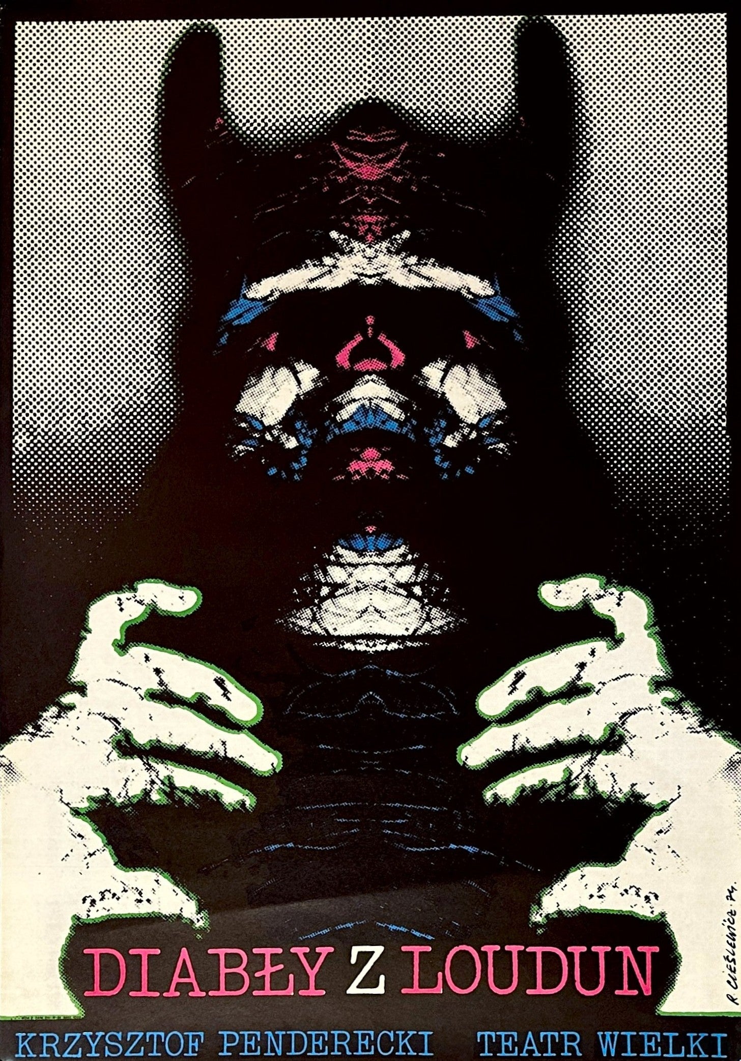 Designed by Roman Cieślewicz, this striking Polish poster was created for a theatrical production of Diabły z Loudun (The Devils of Loudun), the opera by Krzysztof Penderecki, staged at Teatr Wielki. Penderecki’s opera is based on Aldous Huxley’s account of the infamous seventeenth century Loudun possessions, a story rooted in mass hysteria, religious fanaticism, political power, and psychological manipulation.