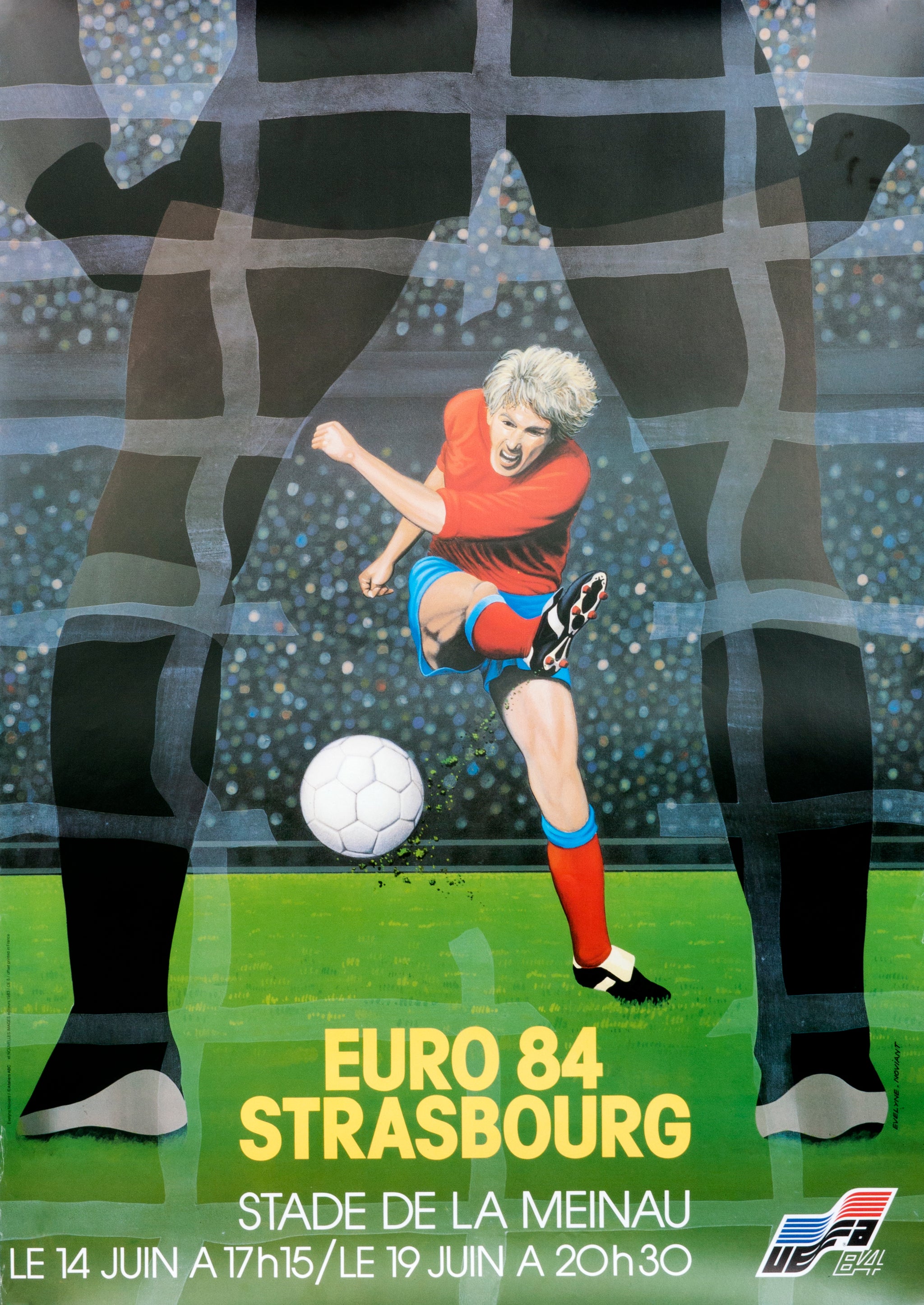 France welcomed the 1984 UEFA European Championship with a custom poster for every venue, and Strasbourg scored big with this dynamic design by French illustrator Evelyne Noviant, printed in 1983 for tournament promotion. The sheet trumpets two group-stage clashes at Stade de la Meinau on 14 June and 19 June, moments that helped set the stage for Michel Platini’s record-breaking run and France’s first Euro title.