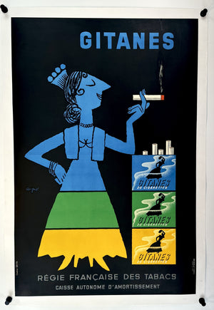 Playful, clever, and utterly French, this original 1954 lithograph by Raymond Savignac brings the iconic Gitanes cigarette brand to life with his signature wit and minimalism. A stylish gypsy woman, rendered in bold blocks of blue, green, and yellow, strikes a confident pose as smoke curls from her elegantly held cigarette, a perfect embodiment of mid-century French design.