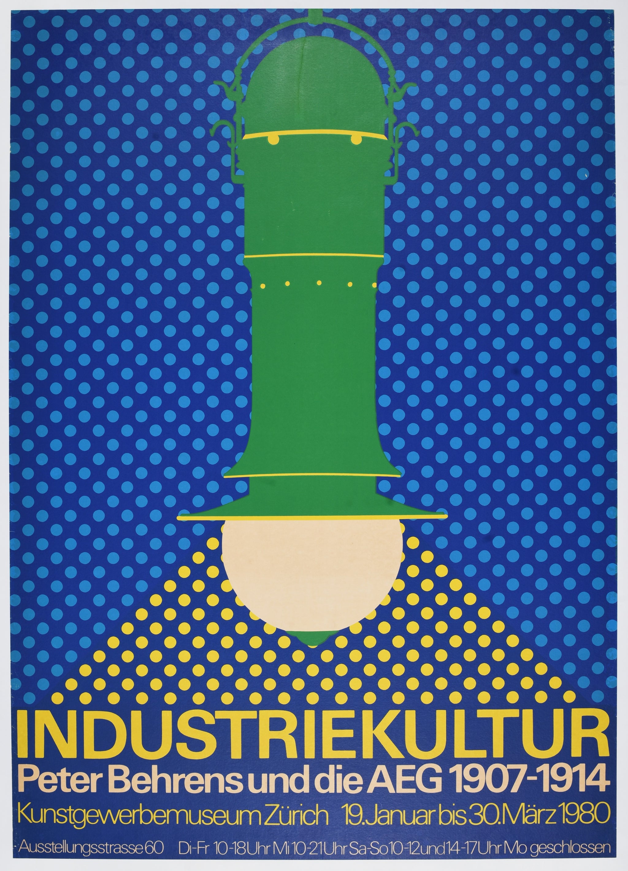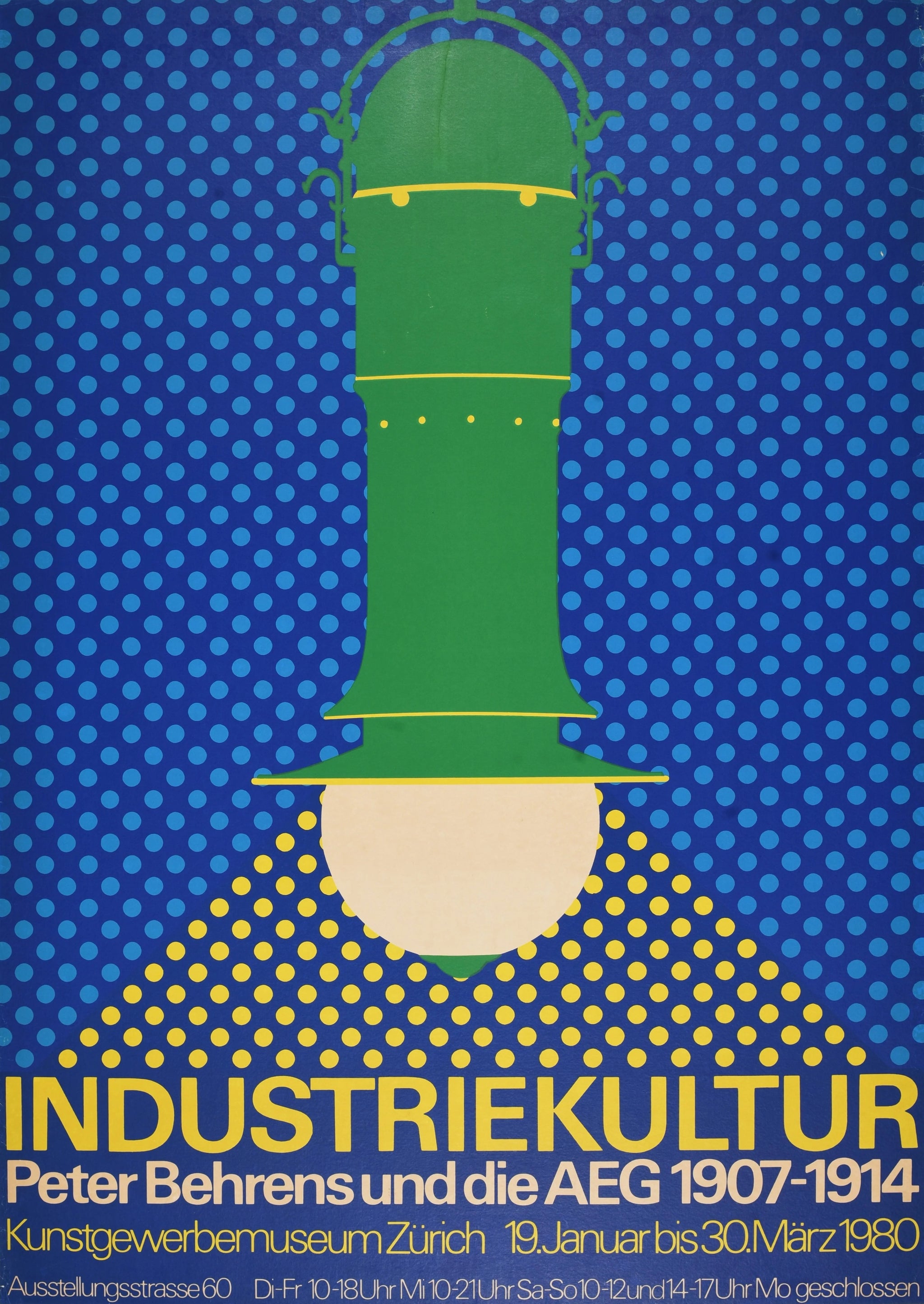 This striking Swiss exhibition poster celebrates one of the most consequential partnerships in design history: Peter Behrens' work for AEG from 1907 to 1914. The bold graphic treatment transforms one of Behrens' iconic industrial lamp designs into a powerful visual statement, rendered in vivid green against a rhythmic field of blue polka dots that suggests both industrial repetition and modernist pattern-making.