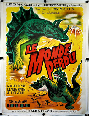 This roaring French release poster for Le Monde Perdu (translated as The Lost World) throws you right into Irwin Allen’s 1960 adventure of prehistoric pandemonium. Inspired by Sir Arthur Conan Doyle’s classic tale, it follows a fearless expedition led by Professor Challenger, played by the ever-commanding Claude Rains, as he sets off to prove that dinosaurs still walk the Earth. Joined by Michael Rennie and Jill St. John, the crew plunges into a South American plateau teeming with volcanoes, monsters, and mayhem.