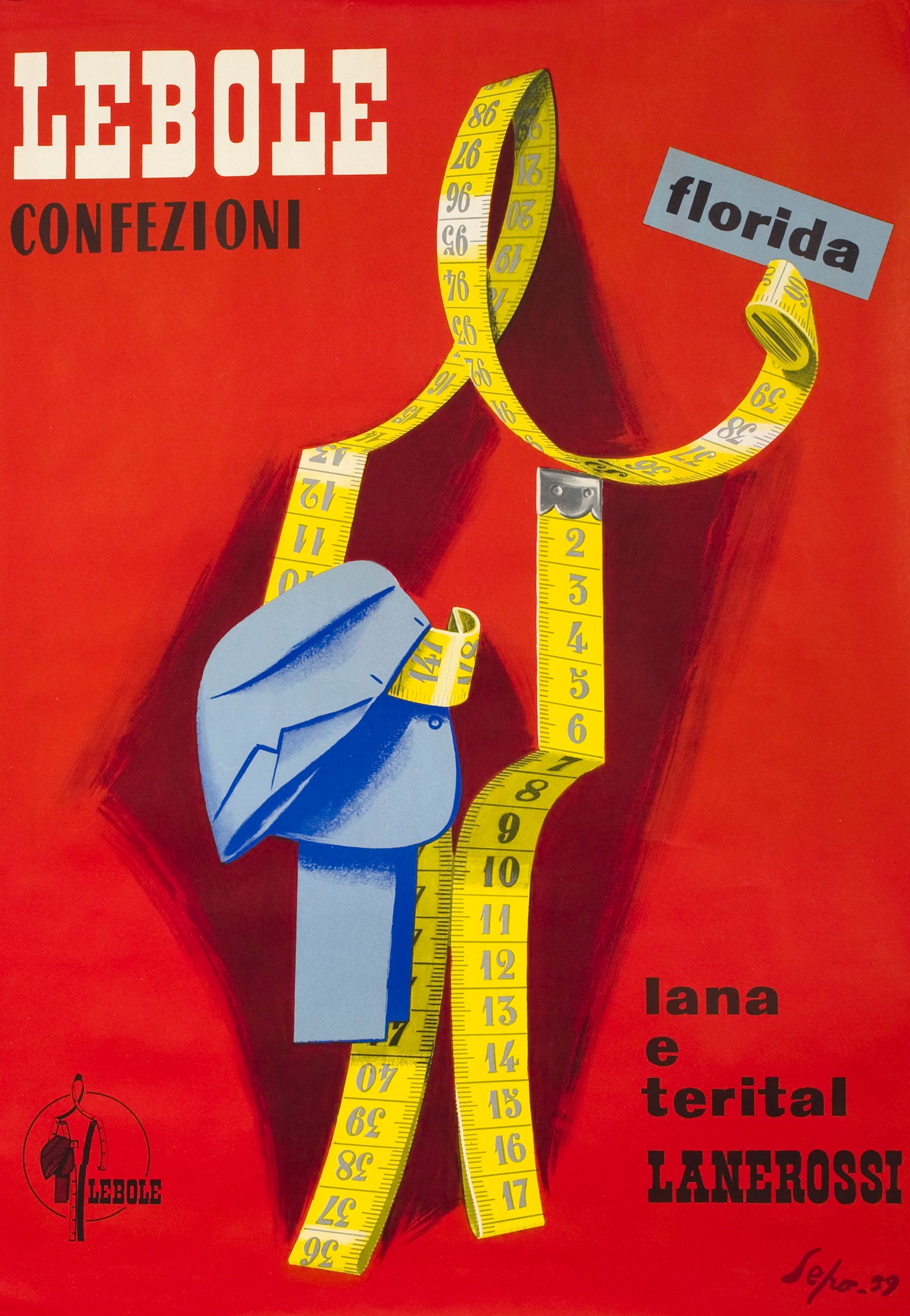 Tailoring meets surrealism in this striking 1959 Italian poster by Sepo (Severino Pozzati), one of Italy’s great modernist designers. Created for Lebole Confezioni, a menswear company celebrated for its sharp tailoring, the design transforms a simple measuring tape into the outline of a man’s suit, crowned with a crisp blue hat. Against a vivid red background, Sepo turns the tools of the trade into pure graphic poetry.