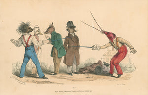 The delicate hand-coloring brings each character to vivid life, from the indignant red lobster to the formally attired fox seconds. A charming addition to any collection of French illustration or satirical art.