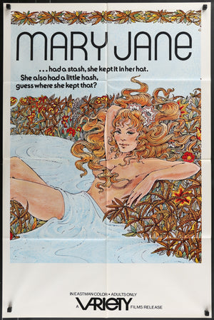 This 1972 Mary Jane poster was released by Variety Films in Eastman Color and rated Adults Only. The film belongs to that moment in the early 70s when counterculture cinema leaned into psychedelic imagery, risqué humor, and subjects that mainstream studios wouldn’t touch. It was cinema meant to shock a little, tease a lot, and ride the wave of underground culture that was spilling into popular media!