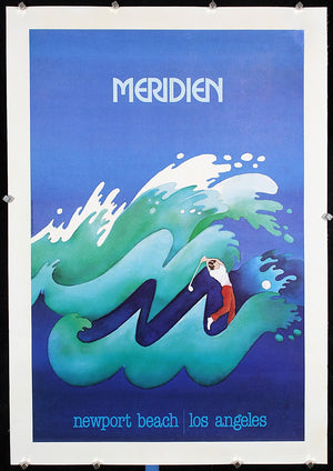 This original 1975 travel and lifestyle poster was created for Meridien, a luxury hotel brand known for its stylish, modern properties along the California coast. The design was part of a promotional campaign highlighting the brand’s Newport Beach and Los Angeles locations, both celebrated for their surf culture, golf resorts and relaxed coastal glamour.
