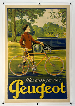 This elegant 1919 French stone lithograph for Peugeot captures the spirit of postwar optimism and mobility in perfect harmony. Titled Moi aussi j’ai une Peugeot (“I also have a Peugeot”), it links the prestige of Peugeot automobiles with the accessible sophistication of its bicycles, a celebration of freedom, design, and French craftsmanship.