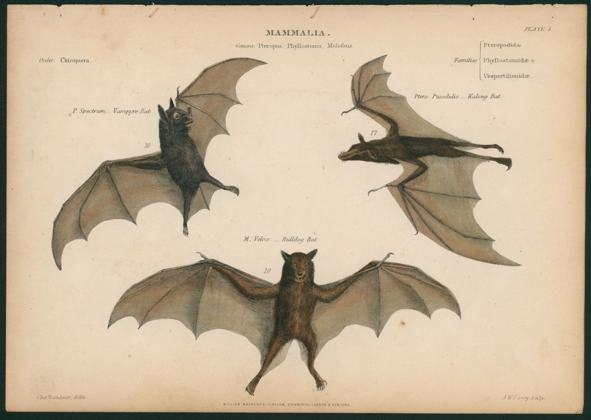 Steel plate engraving created exceptionally crisp detail, and the hand coloring added depth to each wing membrane and fur texture. This plate features three species of bats, including Pteropus, Phyllostoma, and Molossus, shown with outstretched wings to highlight their anatomy within the order Chiroptera. Victorian natural history prints often combined scientific accuracy with a dramatic visual presentation, and this page captures that balance beautifully.