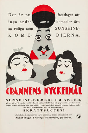 This original 1920 Swedish poster advertises Grannens Nyckelhål, a Sunshine comedy in two acts. Sunshine Comedies were a popular American silent comedy series known for fast pacing, slapstick timing, and inventive visual tricks. Imported into Sweden by Aktiebolaget Fribergs Filmsbyrå, they quickly built a reputation for guaranteed laughs and became a staple of early cinema programs.