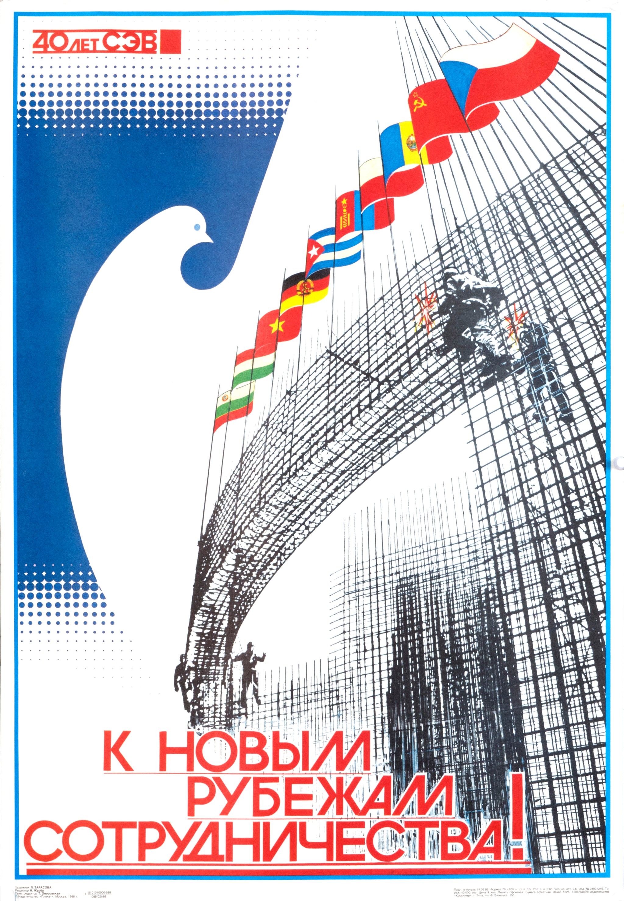 Designed by L. Tarasova in 1988, this poster was created to celebrate the 40th anniversary of COMECON, the Council for Mutual Economic Assistance. Established in 1949 as the socialist world’s answer to the Marshall Plan, COMECON linked the economies of Eastern Europe, the Soviet Union, Cuba, and several developing nations in a vast network of trade and shared production.