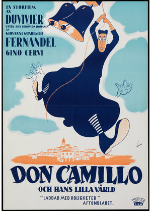 Don Camillo swings from a ringing church bell high above his village, trailed by mischievous cherubs and framed by soft blue clouds. The exaggerated lines and bold navy shapes give the image a whimsical rhythm that fits the film’s lighthearted spirit. Swedish posters for Don Camillo are well loved among collectors, both for their crisp graphic style and their connection to one of the most enduring European comedy franchises of the decade.
