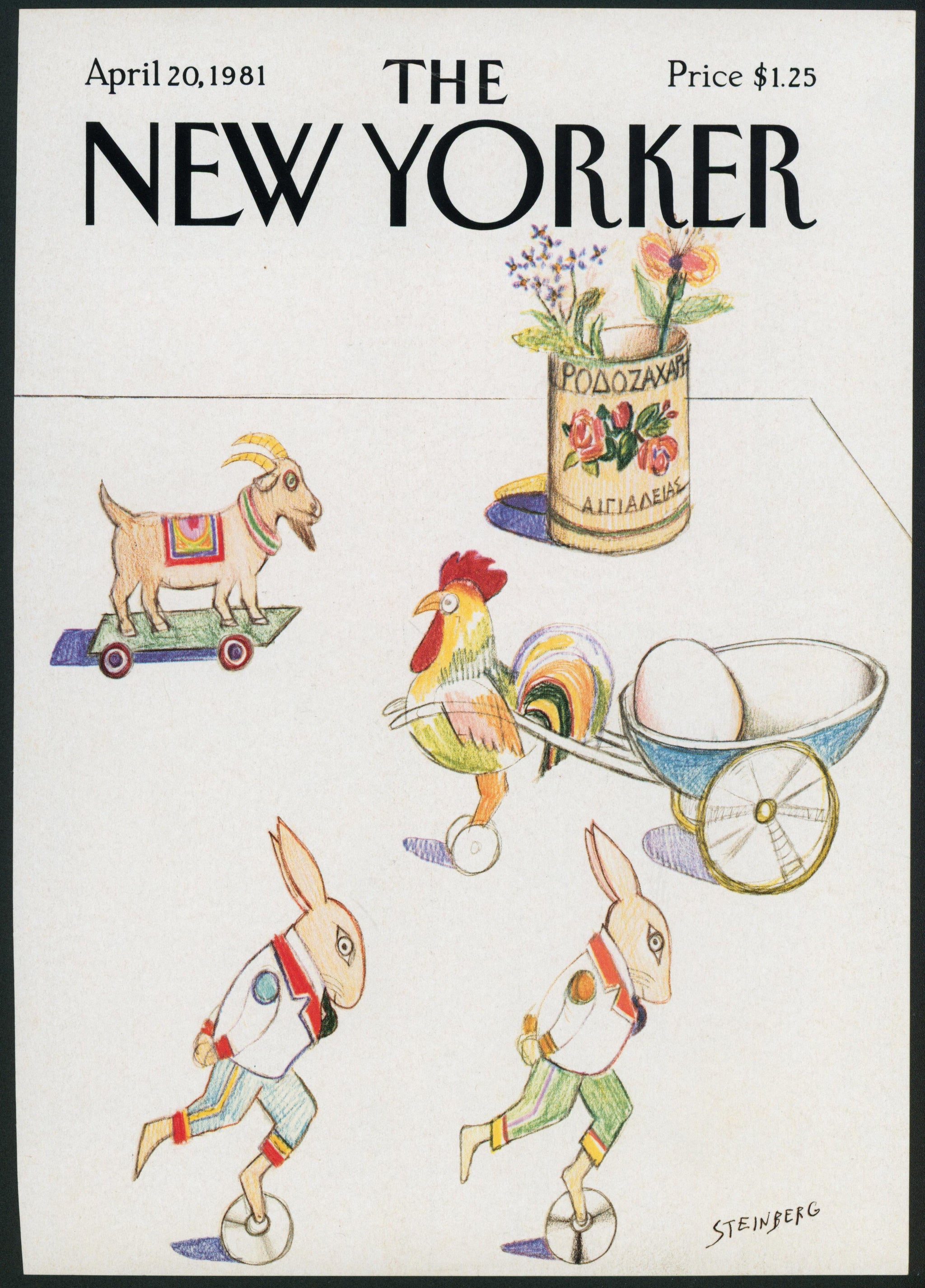 This delightful 1981 New Yorker cover by Saul Steinberg captures the whimsy of Easter through a collection of folk art toys rendered in his signature colored pencil technique. A parade of wheeled creatures including a decorated goat, a rooster pulling an egg cart, and two running rabbits in folk costumes move across a simple tabletop, while flowers bloom from a repurposed tin can labeled in Cyrillic characters.