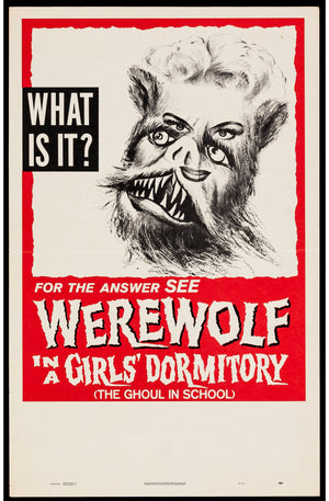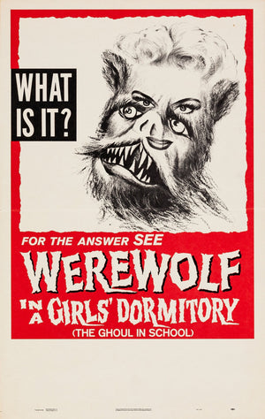 This original 1963 window card delivers everything fans love about mid century horror advertising. Werewolf in a Girls’ Dormitory was an Italian Austrian thriller, released in the U.S. with a new title and a marketing push built on shock, mystery, and pulp drama. The American distributors leaned into the campy charm of “The Ghoul in School,” turning a European creature film into a drive in favorite.